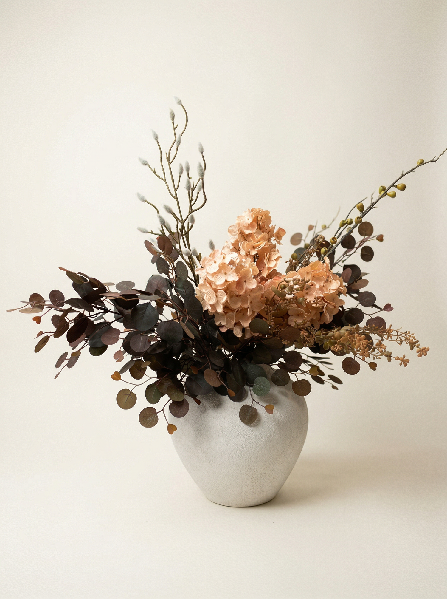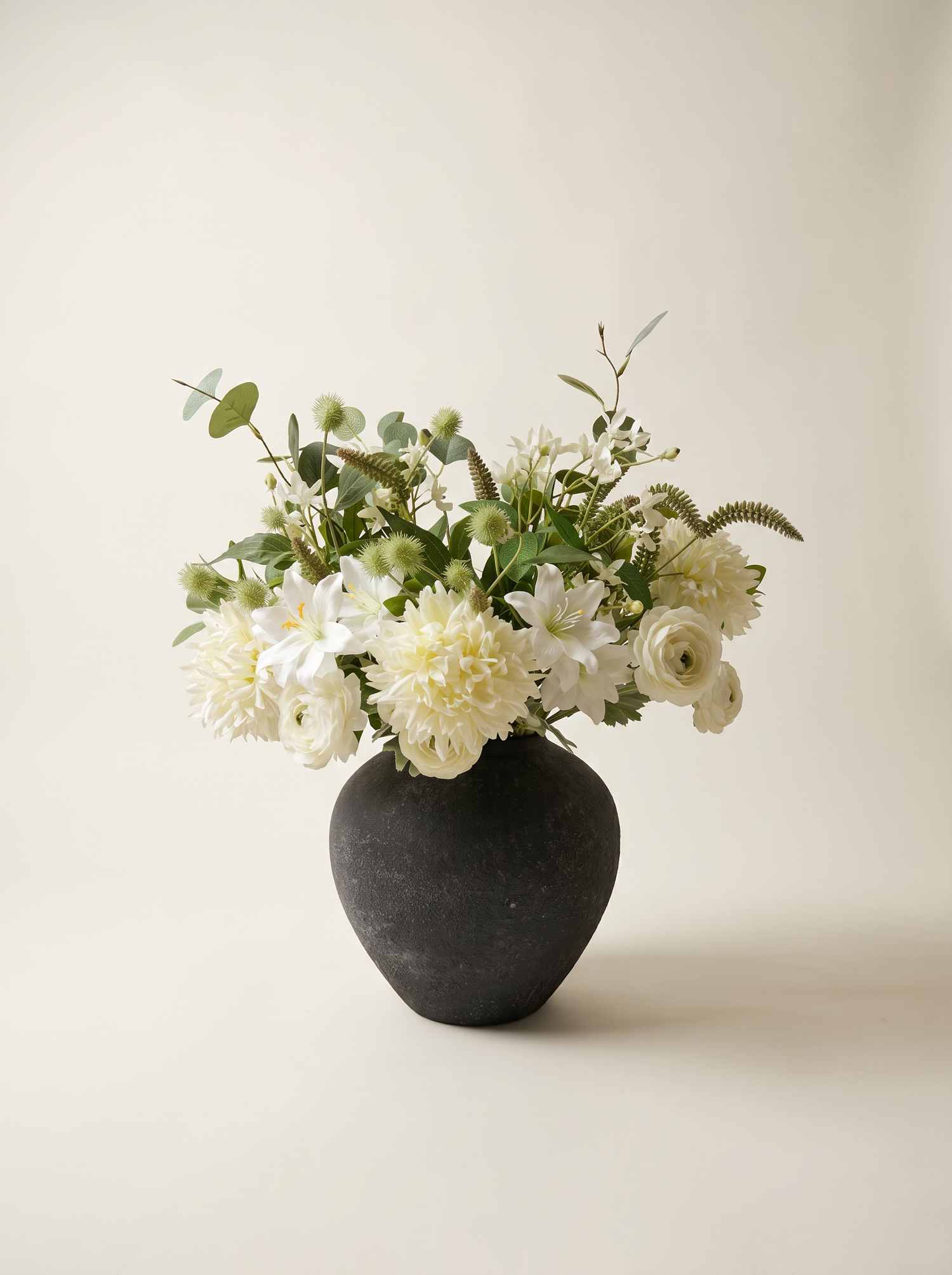 A delicate mix of diverse and varied greens, featuring graceful, cascading sprays of delicate white blossoms paired with rustic, dried seed pods and fine, feather-like greenery, creates a calming, organic backdrop, adding a touch of sophistication and charm. Perfect for dining tables, entryways, or as a centrepiece for special occasions, this arrangement seamlessly complements modern, farmhouse, or traditional decor styles.